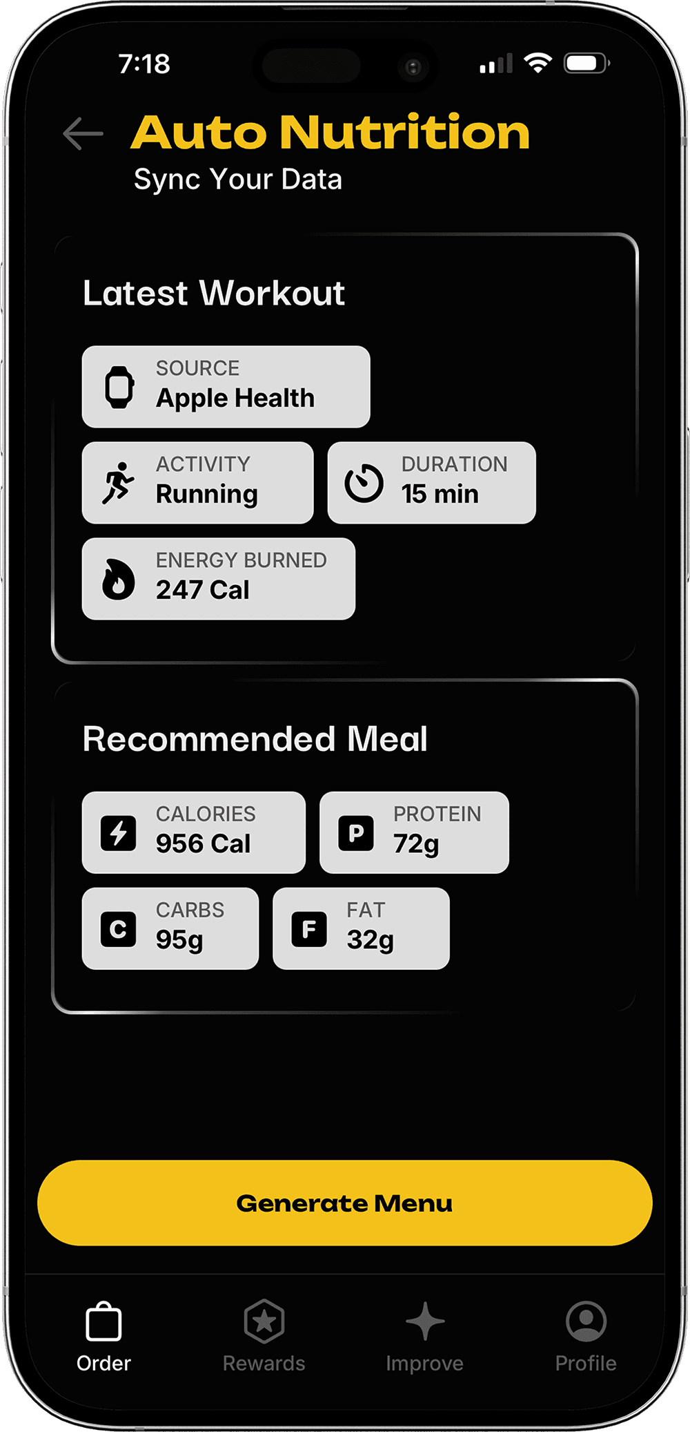 Sync nutrition targets from your wearable and biometric data — or define them yourself. These targets become the source of truth for every meal generated.